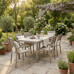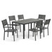 Záhradná zostava AZS-B1656 CRM ponúka praktické a pevné riešenie pre vonkajšie posedenie. Stôl s rozmermi 156 × 78 cm má dosku z polywoodu, materiálu odolného voči poveternostným vplyvom a ľahko udržiavateľného, ktorý verne napodobňuje vzhľad dreva. Rám stola aj stoličiek je vyrobený z kovu v béžovom odtieni s práškovo nanesenou povrchovou úpravou, ktorá zabezpečuje stabilitu a dlhú životnosť. Sada obsahuje šesť stoličiek, z ktorých dve majú operadlá a podrúčky pre pohodlnejšie sedenie, zatiaľ čo ostatné sú bez podrúčok, čo umožňuje variabilné usporiadanie. Dizajn s vodorovnými lamelami na sedadlách a operadlách podčiarkuje moderný a zároveň nadčasový vzhľad celej zostavy.