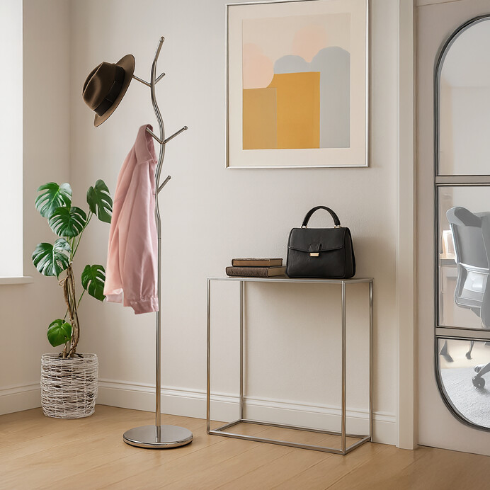 Stojanový vešiak s výškou 180 cm je vyrobený z pevného chrómovaného kovu, ktorý zabezpečuje stabilitu a dlhú životnosť. Dizajn vešiaka tvoria elegantné zakrivené tyče s ôsmimi kovovými háčikmi zakončenými guľatými koncovkami, ktoré chránia odevy pred poškodením. Pevná kruhová základňa prispieva k vyváženosti a bezpečnému postaveniu aj pri plnom zaťažení do 10 kg. Vešiak je vhodný pre domácnosti aj kancelárie, kde ponúka praktické a štýlové riešenie na zavesenie kabátov, búnd či doplnkov.