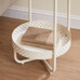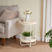 Odkladací stolík s rozmermi 40x40x55 cm kombinuje dosku z MDF s dekorom bieleného dubu a matnou povrchovou úpravou s pevným kovovým prevedením v béžovej farbe. Okrúhla doska ponúka stabilnú plochu na odloženie drobných predmetov, zatiaľ čo spodný odkladací priestor s perforovaným kovovým okrajom poskytuje praktické miesto na ďalšie uskladnenie. Kovové nohy sú vybavené rektifikačnými pätkami, ktoré umožňujú vyrovnanie stolíka na nerovnom povrchu a zabezpečujú stabilitu. Celkový dizajn je jednoduchý a funkčný, vhodný do moderných aj klasických interiérov.