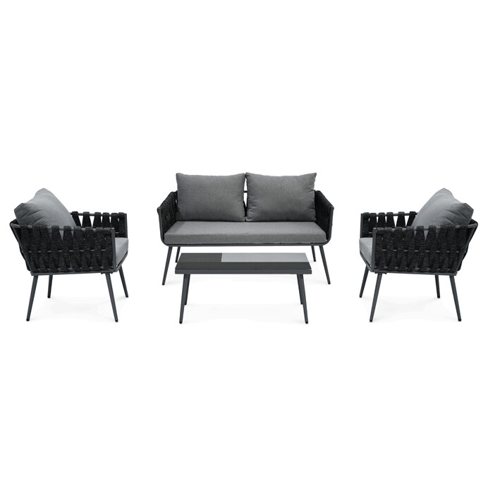 Záhradná zostava 1+3 v šedom prevedení kombinuje pevnú kovovú konštrukciu s odolnou doskou z tvrdeného skla, ktorá sa ľahko udržiava a je vhodná na vonkajšie použitie. Sedacia časť pozostáva z robustných rámov opletených širokým textilným pásom, ktorý dodáva nábytku moderný a nadčasový vzhľad. Polstrovanie v šedej farbe zabezpečuje pohodlie pri sedení a je navrhnuté tak, aby bolo príjemné na dotyk aj odolné voči poveternostným vplyvom. Súprava obsahuje trojsedačku a dve samostatné kreslá, ktoré dopĺňa praktický stolík s doskou z tvrdeného skla, ideálny na odloženie nápojov či drobných predmetov. Celkový dizajn je elegantný a zároveň funkčný, čo umožňuje využitie zostavy na terase aj v záhrade.