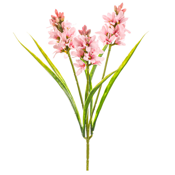 Umelý hyacint v jemne svetloružovom odtieni ponúka tri kvetinové hlavy s detailne spracovanými okvetnými lístkami a dlhými zelenými listami, ktoré verne napodobňujú prírodný vzhľad. Plastové prevedenie zabezpečuje jednoduchú údržbu a dlhodobú stálosť farieb. Kvetina je vhodná do aranžmánov v interiéroch, kde prináša svieži a nežný dekoratívny prvok bez potreby starostlivosti.