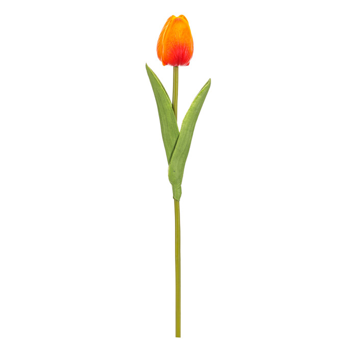 Umelý rezaný tulipán v oranžových odtieňoch je vyrobený z polyuretánovej peny, ktorá verne napodobňuje prirodzenú štruktúru kvetu aj listov. Jeho štíhly stonok a jemné detaily listov dodávajú dekorácii realistický vzhľad, ktorý oživí každý interiér. Vynikne samostatne v úzkej váze alebo ako súčasť kvetinovej aranžmánu. Vďaka použitým materiálom sa ľahko udržiava a zachováva si svoj tvar dlhú dobu. Je vhodný pre všetkých, ktorí hľadajú trvalú dekoráciu bez nutnosti starostlivosti o živé rastliny.