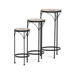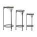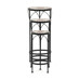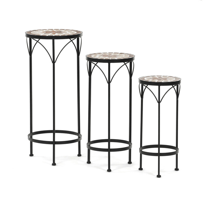 Sada troch stojanov na kvety kombinuje pevnú kovovú podnož s keramickou doskou zdobenou krémovou mozaikou, ktorá vytvára jemný dekoratívny prvok. Každý stojan má inú výšku, čo umožňuje variabilné usporiadanie rastlín a zaujímavú priestorovú kompozíciu. Kovová podnož je navrhnutá pre stabilitu a dlhú životnosť, zatiaľ čo keramická doska je ľahko udržiavateľná a odolná voči poveternostným vplyvom. Vďaka elegantnému spojeniu materiálov a prírodných odtieňov stojany vyniknú ako v interiéri, tak na terase či balkóne. Vhodné na vystavenie kvetín rôznych veľkostí a typov nádob.