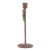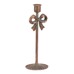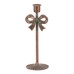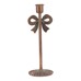 Kovový svietnik v medenom odtieni zaujme dekoratívnou mašľou uprostred stojana, ktorá dodáva jemný a štýlový detail. Je určený pre kužeľové sviečky a vďaka pevnej základni s jemným rebrovaním stojí stabilne na rovnom povrchu. Výška 22 cm umožňuje umiestnenie na stôl, komodu alebo poličku, kde vytvorí príjemnú atmosféru. Povrchová úprava s patinou podčiarkuje vintage vzhľad a ľahko sa udržiava.