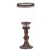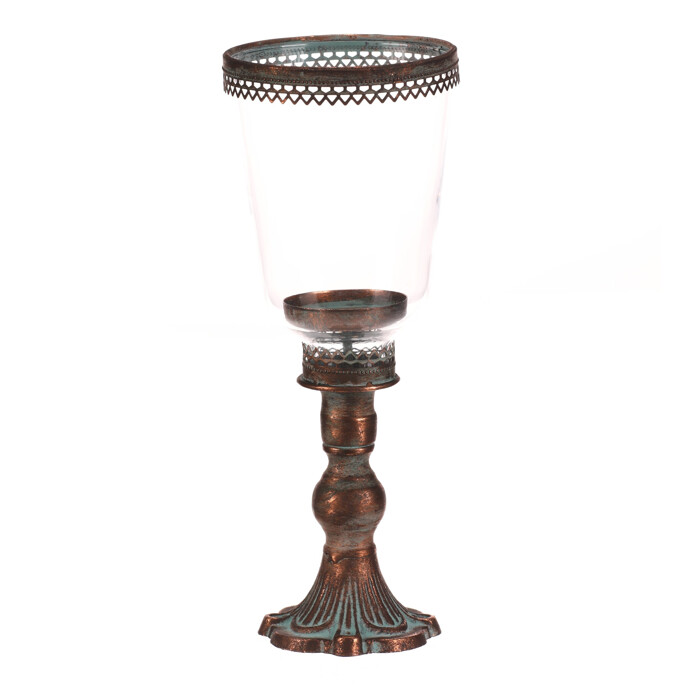 Svietnik v tvare kalicha v medenom odtieni kombinuje kovovú základňu s priehľadnou sklenenou nádobou, ktorá vytvára zaujímavý vizuálny efekt. Jeho zdobená základňa s patinou dodáva rustikálny charakter a stabilitu. Výška 31 cm umožňuje umiestnenie na stôl, komodu alebo parapet, kde vynikne ako dekoratívny prvok aj praktický držiak sviečky. Vhodný na použitie s rôznymi typmi sviečok, predovšetkým valcovými. Provedenie je navrhnuté tak, aby materiál ľahko udržiaval svoj vzhľad aj pri pravidelnom používaní.