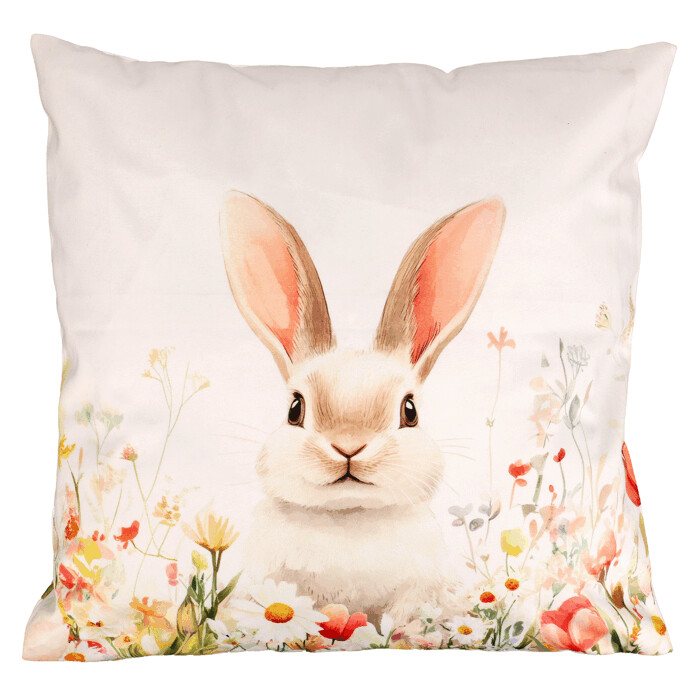 Vankúš s výplňou - zajac v rozkvitnutej lúke, zamatový, 45 x 45 cm