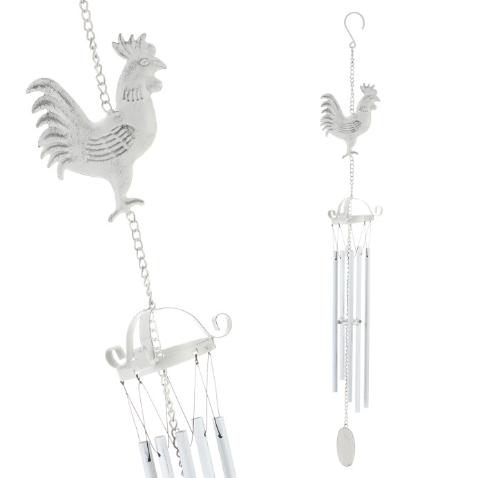 Kovová zvonkohra s motívom kohúta v bielom odtieni je vhodná na zavesenie na terasu, balkón alebo do interiéru. Jej kovové trúbky vytvárajú príjemný zvuk pri pohybe vzduchu, čo prispieva k relaxačnej atmosfére. Zvonkohra je vybavená praktickým háčikom na jednoduché zavesenie a jej detailné spracovanie kohúta dodáva dekorácii rustikálny charakter. Vďaka odolnému kovovému prevedeniu je navrhnutá pre dlhú životnosť a jednoduchú údržbu.